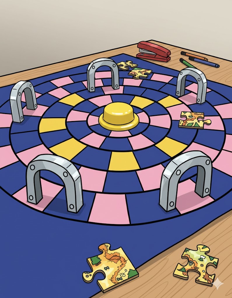 Arkano is a dynamic, luck-and-challenge-based board game where players race to activate the central Yellow Button (the ultimate objective) by navigating a track driven by risk-reward movement.